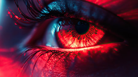A dramatic close up of a womans eye with a vibrant red light shining on it, creating an intense and striking visual, Eye-catching red background with a sense of drama