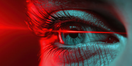Futuristic Close Up of Eye with Red Laser Beam and Dramatic Lighting.
