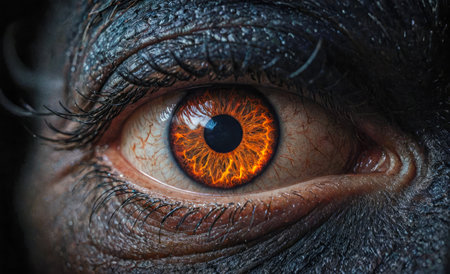 Macro shot of demon eye with black skin, intense and fiery gaze, vivid orange and red iris patterns radiating energy, mystery and power. close up