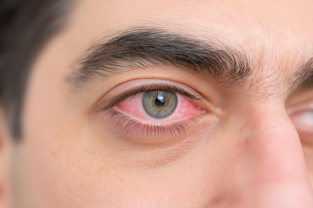 A macro shot of a man's eye, which is red, bloodshot, and inflamed, indicating an allergic reaction, infection like conjunctivitis, or fatigue.