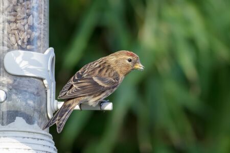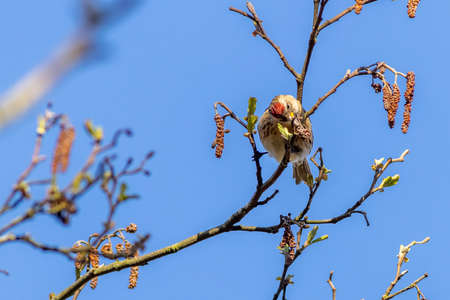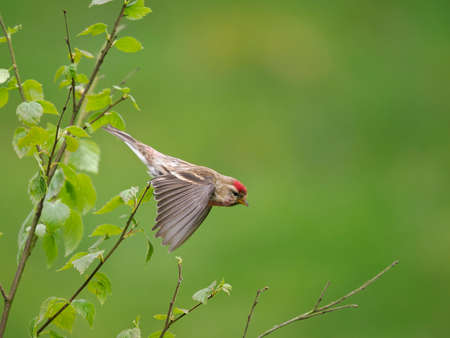 Lesser redpoll, Acanthis cabaret, Single bird in flight, Scotland, May 2022
