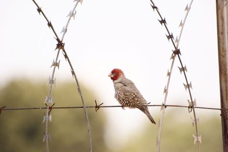 Red avadavat (Amandava amandava) bird perching on dry bushes in the forest.