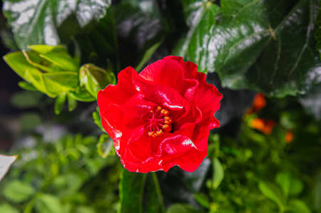 close-up of red hibiscus plant with big flower outdoor in sunny backyard shot at shallow depth of field