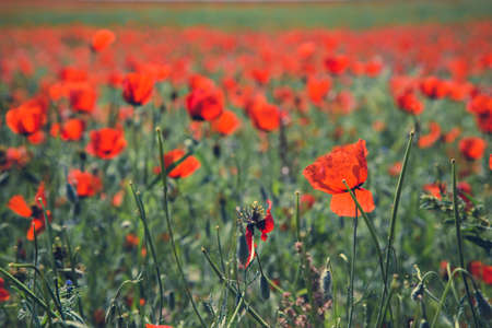Field of wild poppy flowers. Toned picture