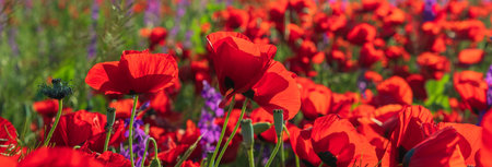 Field poppies sunset light banner. Red poppies flowers bloom in meadow. Concept nature, environment, ecosystem.