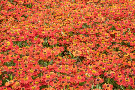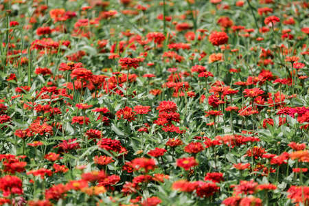 Close-up of a beautiful flower bed with red flowers, soft selective focus