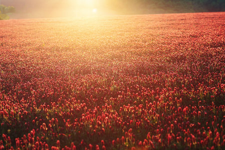 Beautiful flowering meadow at sunset, Red flowers meadow.