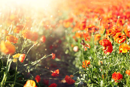 beautiful Ranunculus flowers in a field aka buttercup flower, blooms in vibrant warm red color. Spring time