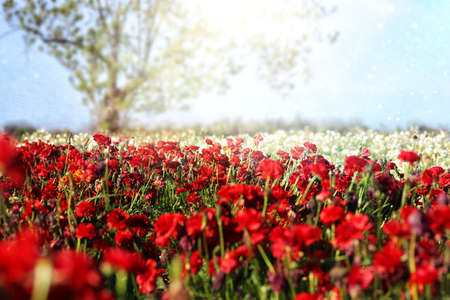 Meadow with beautiful bright red poppy flowers in spring