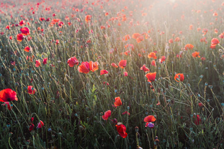 Field of red poppies in bright evening light