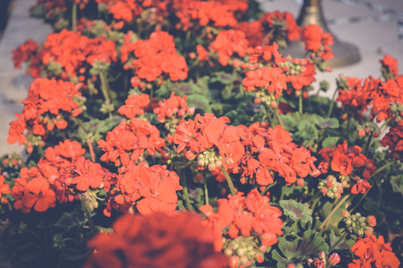 Lush blooming bush geranium with bright scarlet flowers. horizontal photo