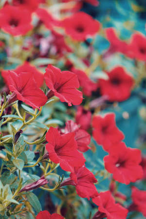 Million bells flower detail. Summer red and purple blooms. Beautiful plants in garden. Decoration for summer house