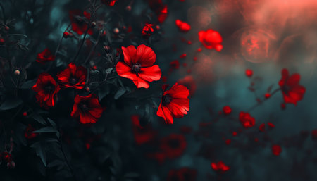 Surreal artistic photography of vibrant red flowers and lush green plants in dreamlike composition