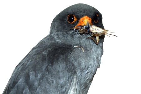 Male red-footed falcon (Falco vespertinus) is eating a cricket - isolated