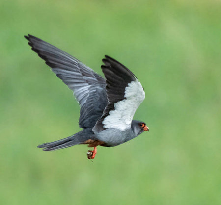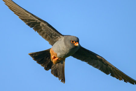 A male red footed falcon in flight, sunny day in summer, blue sky