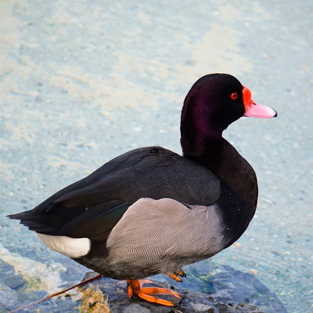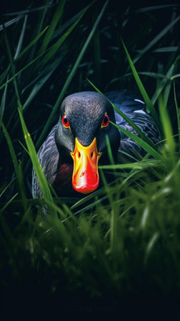 Red beak of black duck with orange eyes