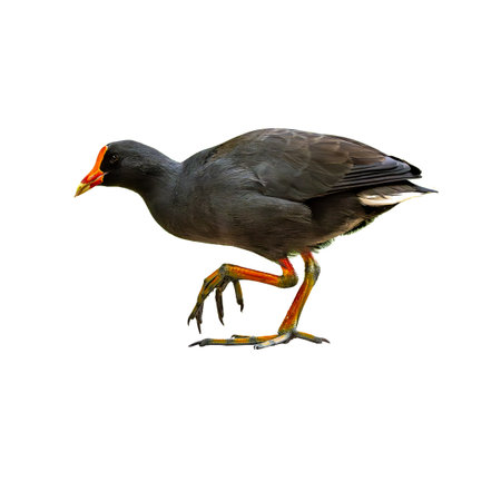 Close-up side view of a Dusky Moorhen with dark plumage, red and yellow bill, and bright orange legs, walking against a clean white background.