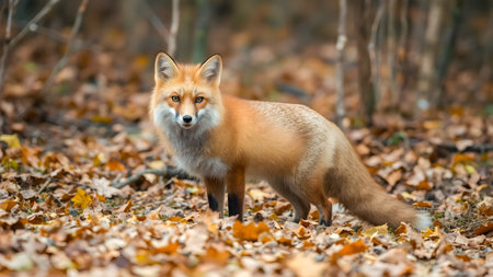 A fox stands amidst a forest floor carpeted with fallen leaves during autumn. The image showcases warm, orange hues and soft lighting. The composition is centered, creating a focused view of the animal. This imagery is suitable for various editorial and commercial projects.