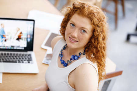 Portrait of a beautiful young redhead woman using laptop at home