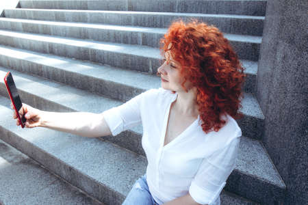 One woman with bright curly red hair sitting on the stairs, looks at her mobile phone. Lady outside the house. Casual life of young female. City lifestyle