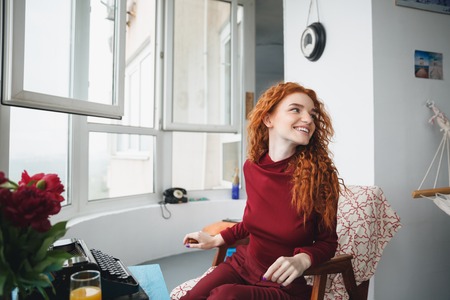 Portrait of a smiling happy redheaded woman sitting on a chair at the table with typewriter at home