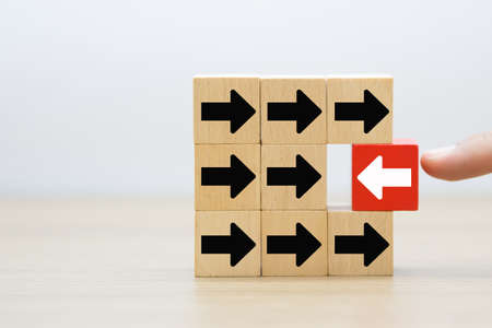 Businessman hand choose cube wooden toy blog with arrow head icons pointing to opposite directions for business change leader to growth and success concepts.