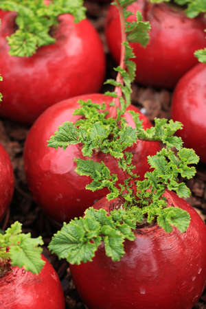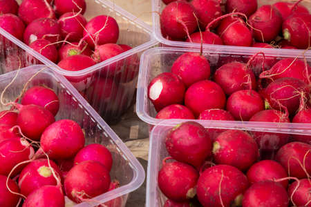 Harvest radishes in containers. Freshly picked purple colorful radish. Growing radish. Growing vegetables. Healthy food background. European radish Raphanus sativus