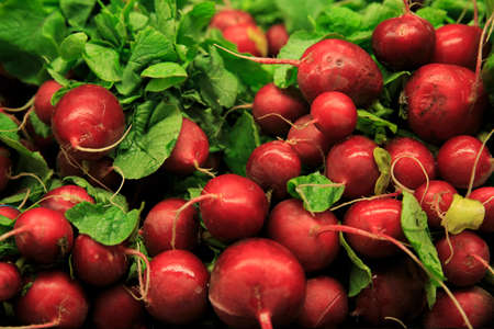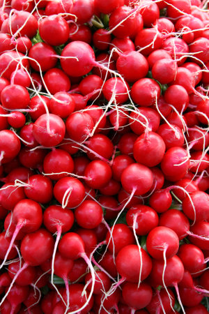 Radish (Raphanus raphanistrum) for sale on a market stall. Radishes are grown and consumed throughout the world, being mostly eaten raw as a crunchy salad vegetable with a pungent flavor. There are numerous varieties, varying in size, flavor, color, and length of time they take to mature