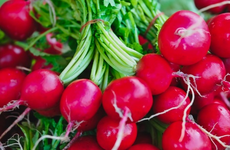 bunch of freshly harvested organic radishes. Growing seasonal vegetables, from the garden, for sale at local farmers market