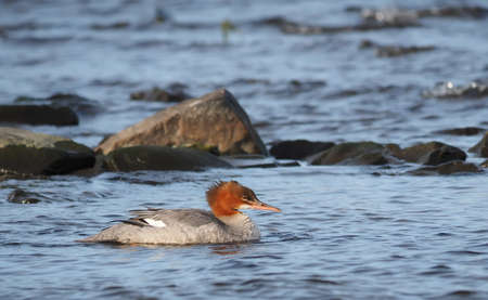 The common merganser or goosander, Mergus merganser, swimming on the water surface.