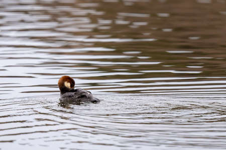 A Common Pochard swimming on a pond, cloudy day in autumn