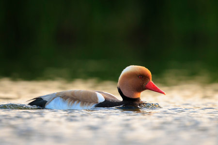 Male red-crested pochard Netta rufina waterfowl swimming in a pond. Colorful and sunny day, low point of view.