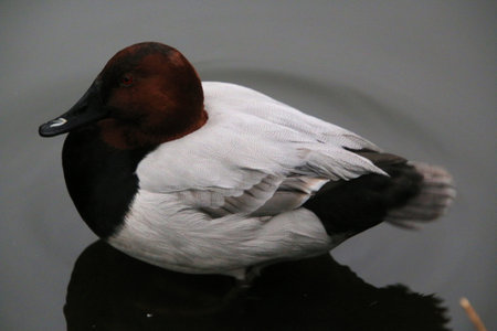 A canvas back duck crusing a pond.