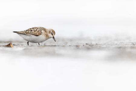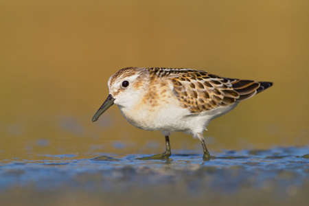 Closeup of a Little stint, Calidris minuta, small wader bird foraging in wetland.
