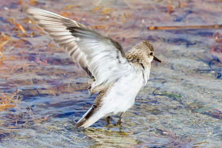 Red-necked stint is bathing in a place where fresh water is springing up on a sandy beach