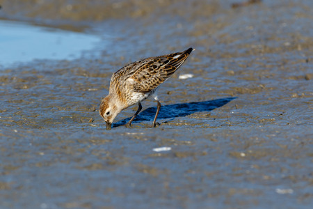 Little Bird Sandpiper looking for food on the shore of the river Kazanka. Kazan, Russia. The Baird's sandpiper (Calidris bairdii) is a small shorebird.