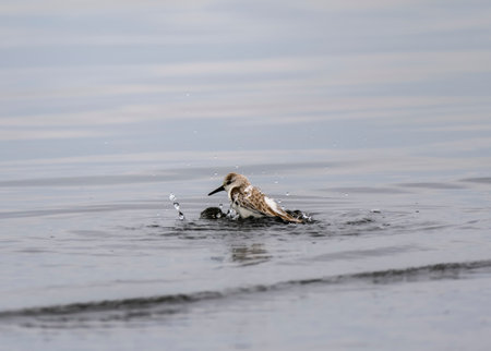 A sanderling's sandpiper bird stands in shallow water, creating small splashes as she has bath. The calm morning light reflects on the surface, enhancing the serene coastal atmosphere.