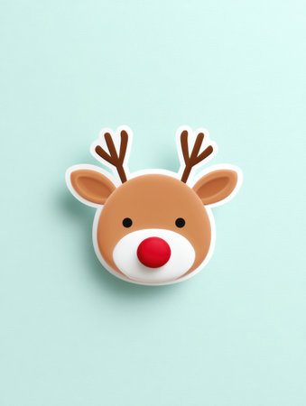 A Reindeer face with a big red nose and antlers is centered on a light blue background. A white border outlines the head giving it a sticker look.
