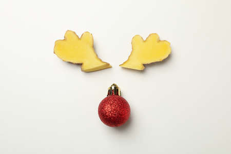 Deer antlers made of ginger and bauble on white background