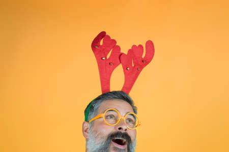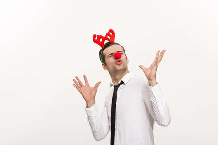Christmas Concept - Handsome Business man wearing reindeer hairband making funny facial expression.