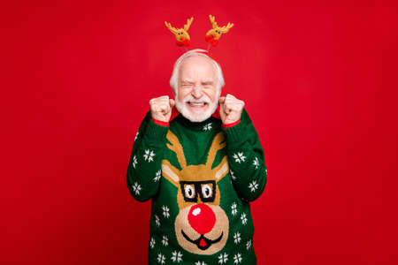 Photo of funny santa man with pretty horns on head celebrating newyear surprise visit from children wear stylish x-mas ugly ornament sweater isolated red background
