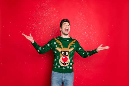 Portrait of his he nice attractive handsome cheerful cheery dreamy guy wearing green deer sweater enjoying leisure throwing snow isolated over bright vivid shine vibrant red color background