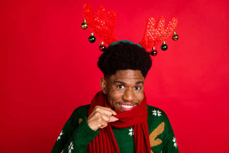 Portrait of attractive cheerful guy wearing cozy warm kerchief festal decor tradition isolated over bright red color background