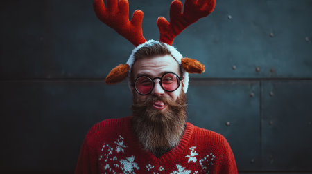 A cheerful man wears reindeer antlers and round glasses sticking out his tongue playfully while dressed in a cozy red sweater.