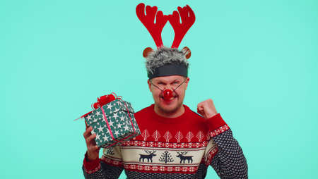 Man in Christmas sweater deer antlers cries because not receive long-awaited gift, after receiving it begins to rejoice. Young adult guy on blue studio background. Happy New Year celebration holidays