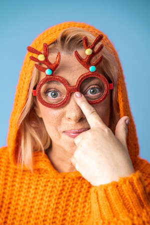 Middle aged woman wearing Xmas glasses touching to her nose with her finger