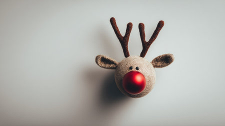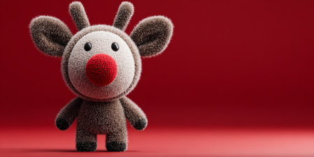 Cute plush toy reindeer stands against a bright red background, evoking a festive holiday spirit during winter season celebrations