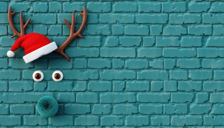 A whimsical Christmas decoration resembling a reindeer face with antlers and a Santa hat, placed on a textured teal brick wall.