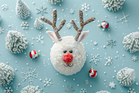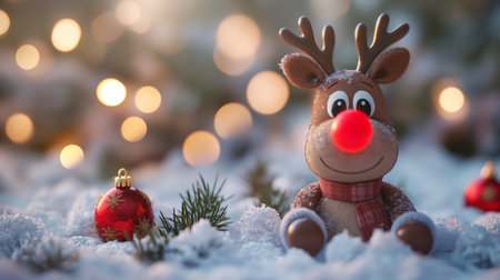 A playful reindeer figurine smiles amid snow with holiday ornaments and a cozy atmosphere. Christmas background. Generative AI