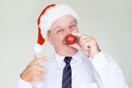 Happy businessman in Santa hat with red bauble